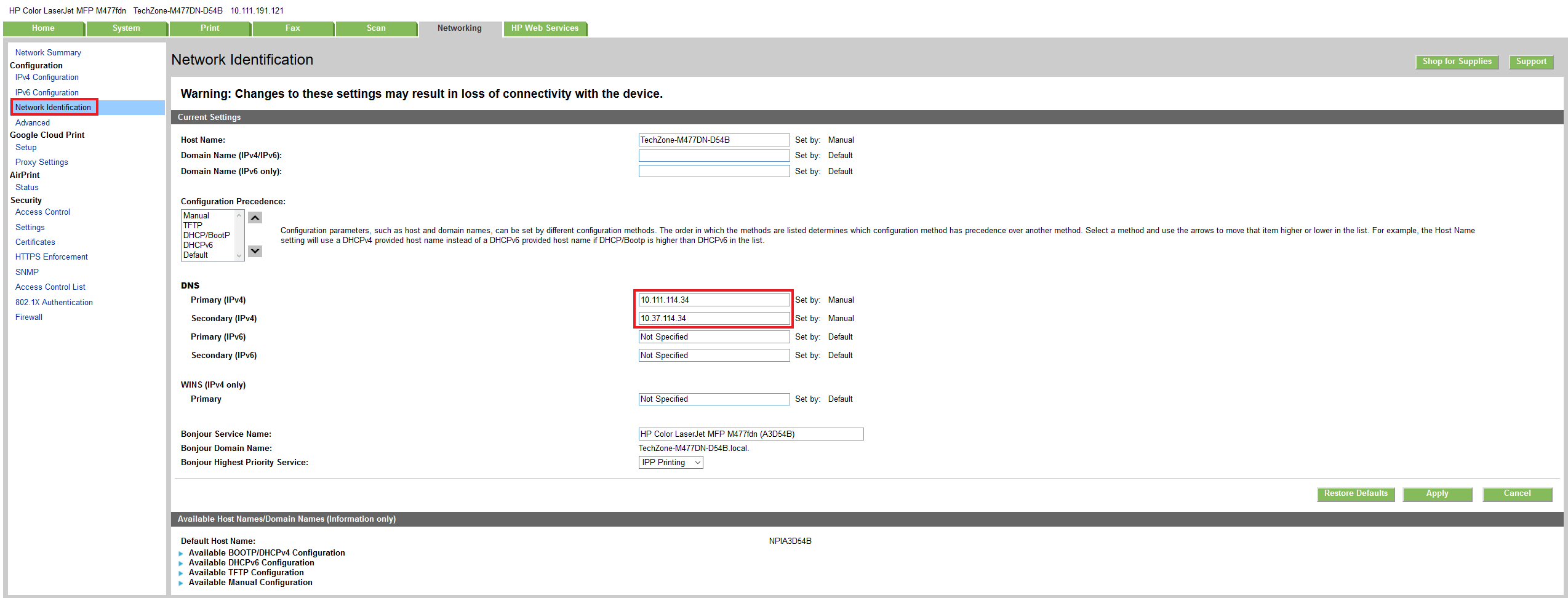 Enter the IPv4 DNS addresses shown below: it is very important you direct the printer to those two addresses.